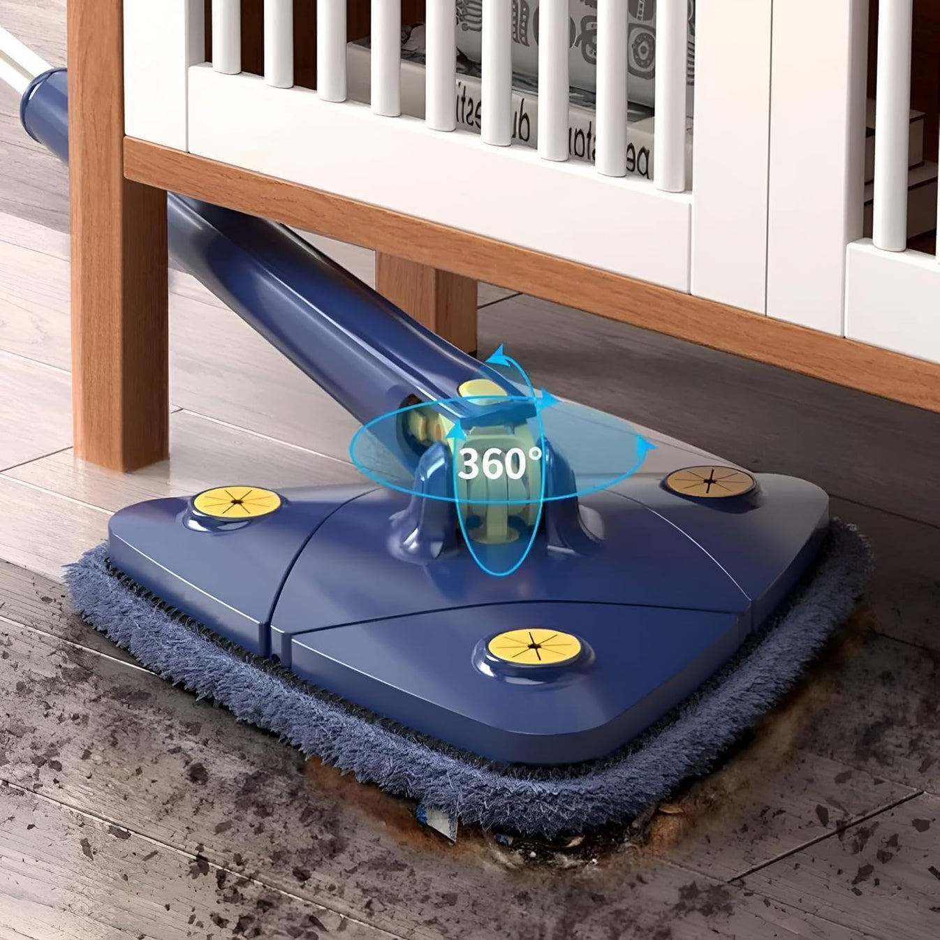 3. Desliza la mopa con movimientos fluidos, aprovechando el ángulo triangular para alcanzar cada esquina.